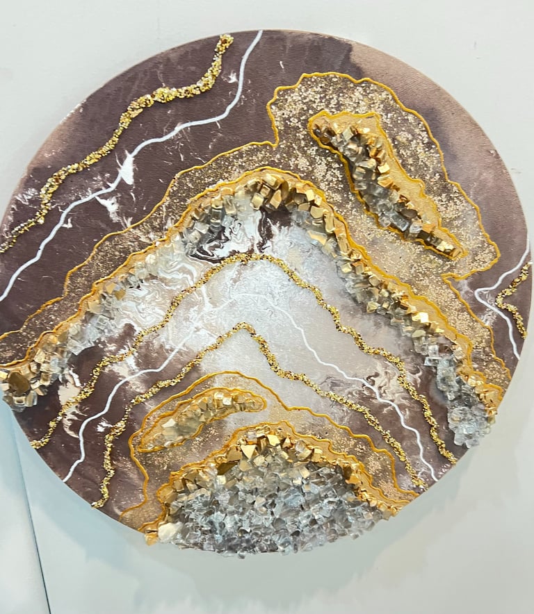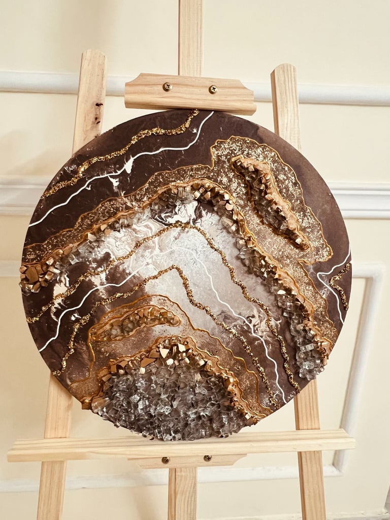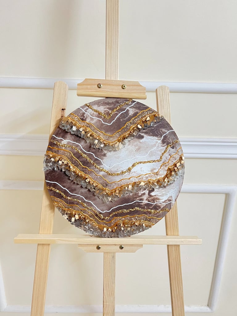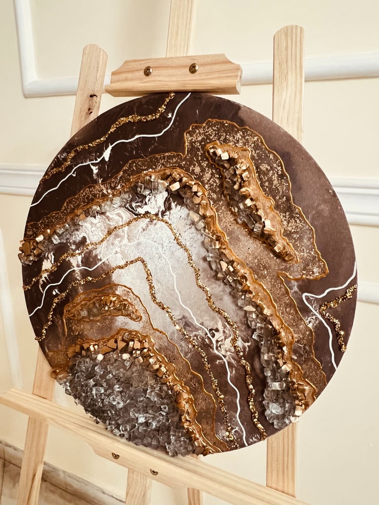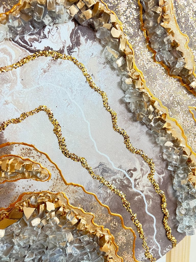 Canvas, acrylic paints, brushes, water, plastic containers, ice-cream sticks, drawing pencils, glue, crystals, glitter, paint liners, Uv resin