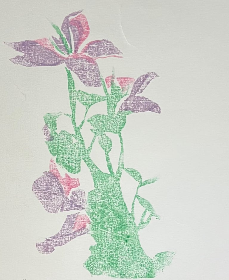 I created a water-based Japanese woodcut print by carving a design into a wooden plate, applying water-based ink to the block and gently rubbing the paper onto it. Repeating this process multiple times resulted in an intricate floral print