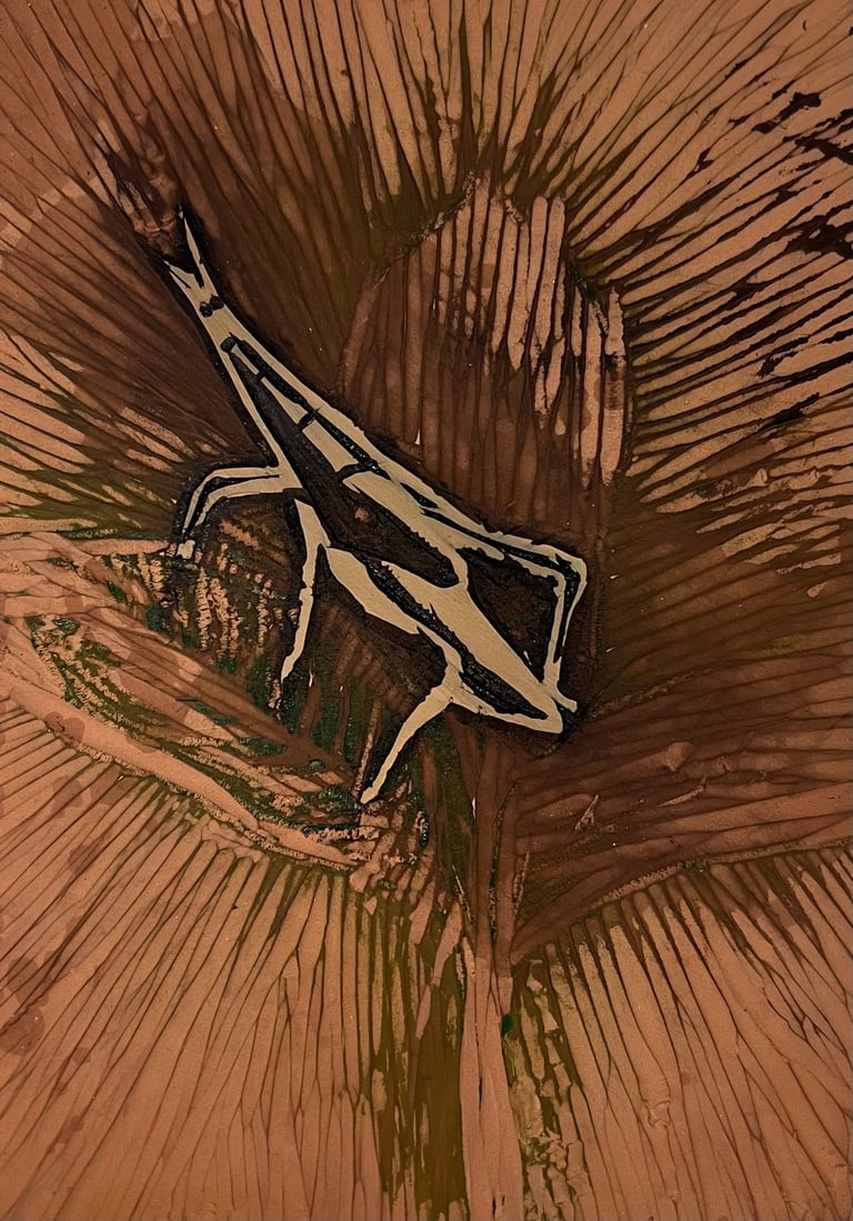 In this process of linocut printing I carved different elements the linocut sheet twice and printed it in two different colors.