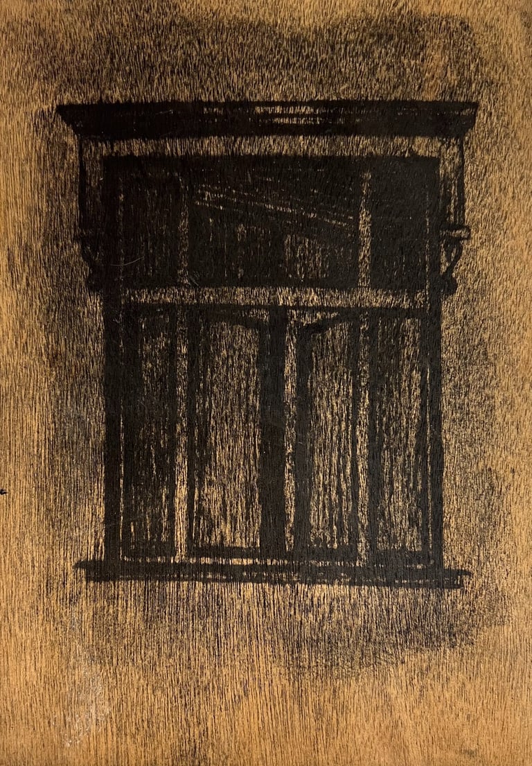 I created a wood lithography print by drawing an image onto a smooth wood surface with a grease based medium, then dusting the surface with baby powder enhancing the contrast. The wood plate was then inked and damp printed sheets were used to create these textured prints